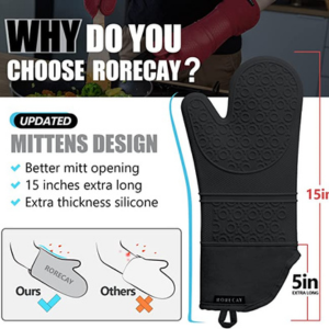 - Compared to the cotton oven mitts, our silicone oven mitts is easy to clean after using, When you’re finished, rinse the oven mitt clean or wipe it down with a damp cloth before hanging it from the convenient loop. The 15-inch extra long oven mitts, trivets and mini pinch mitts are also safe for washing / drying in laundry machine.
